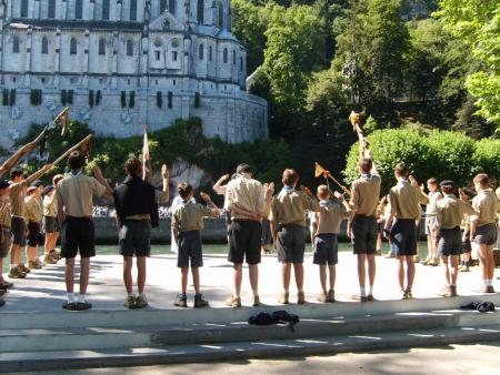 " Un groupe de scouts de Laval en Mayenne entouré de leur prêtre " .