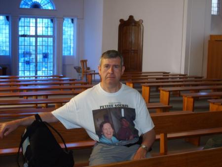 " Mon chéri qui est assis sur un banc du couvent du Carmel de Lourdes" .