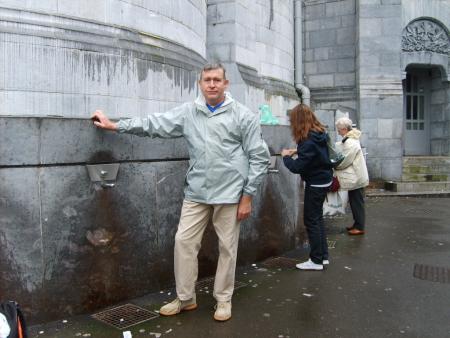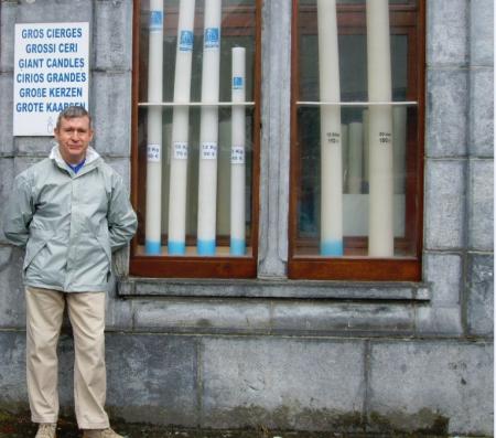 " Voici mon chéri qui pose pour la photo devant les gros cierges, il est heureux de revenir à Lourdes : 36 ans aprés ".