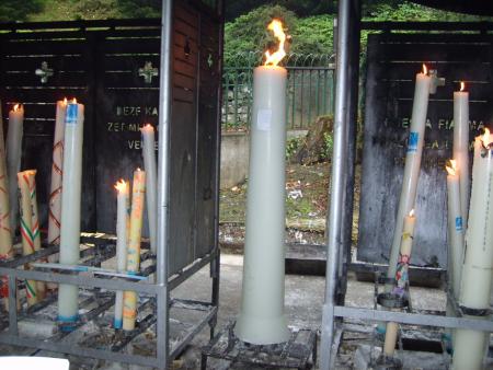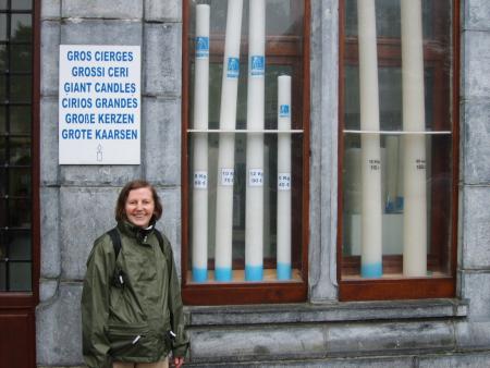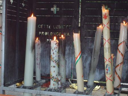 " Voici ma chérie qui pose pour la photo devant les gros cierges avec leurs tarifs ".