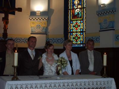 Les mariés entourés de leurs témoins aprés les signatures.